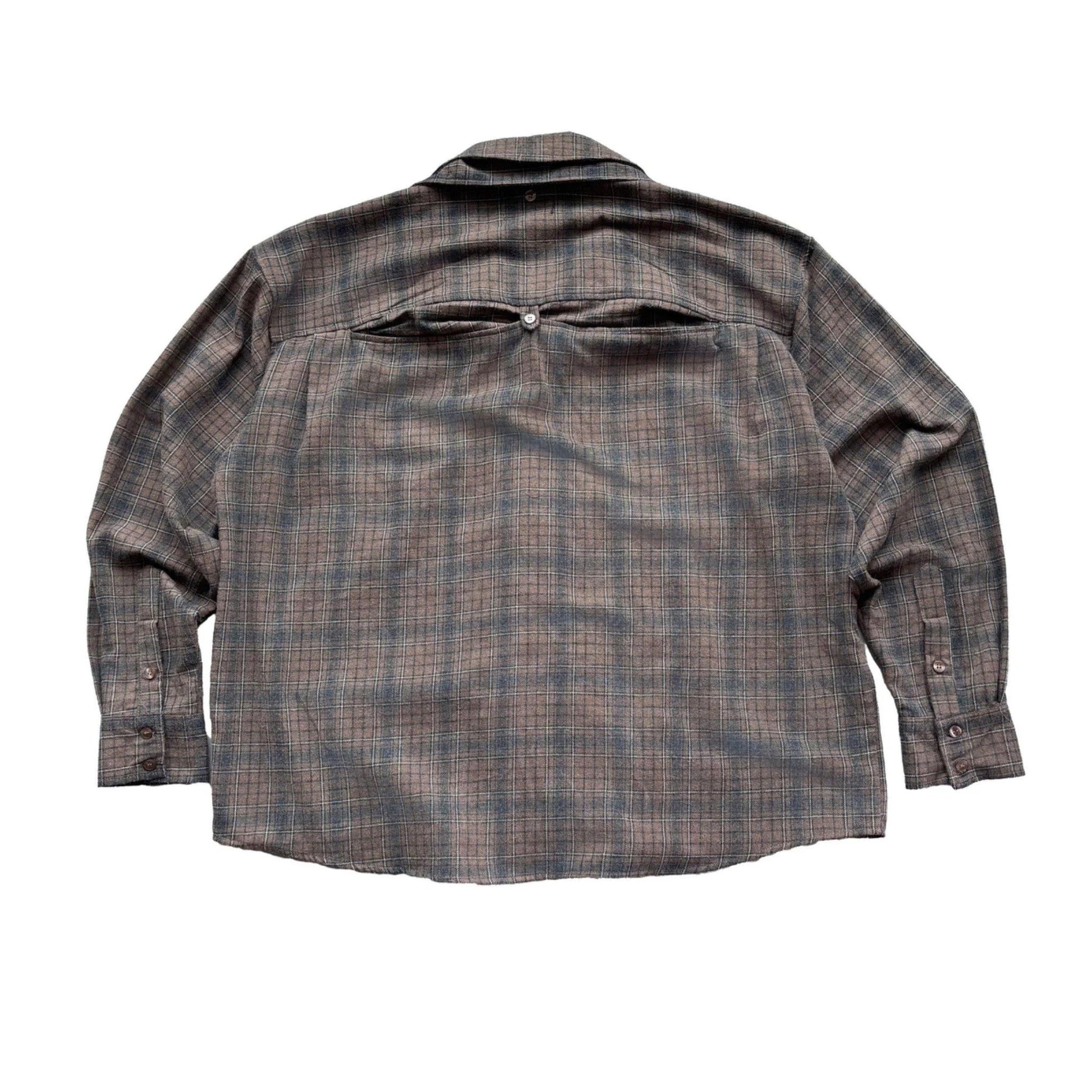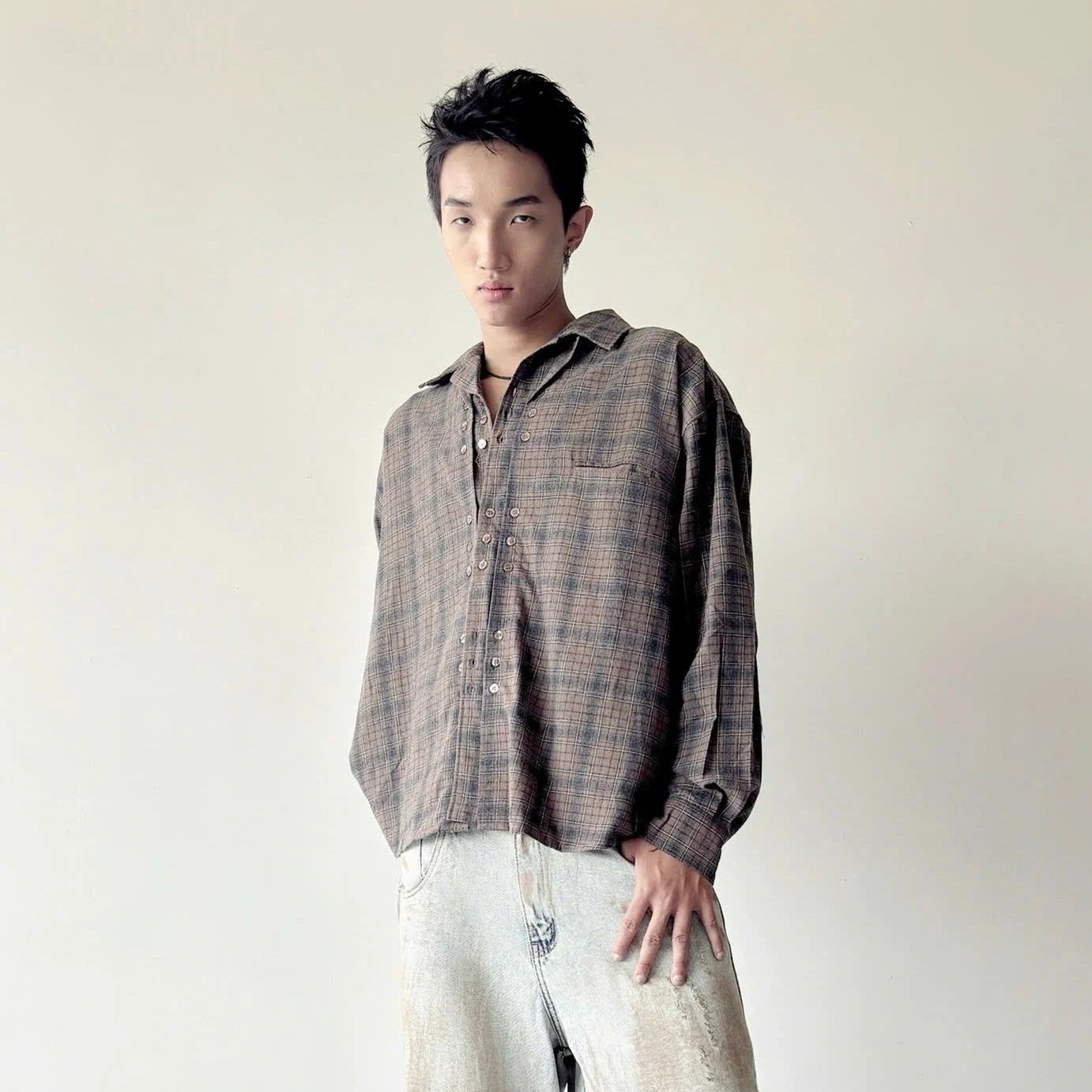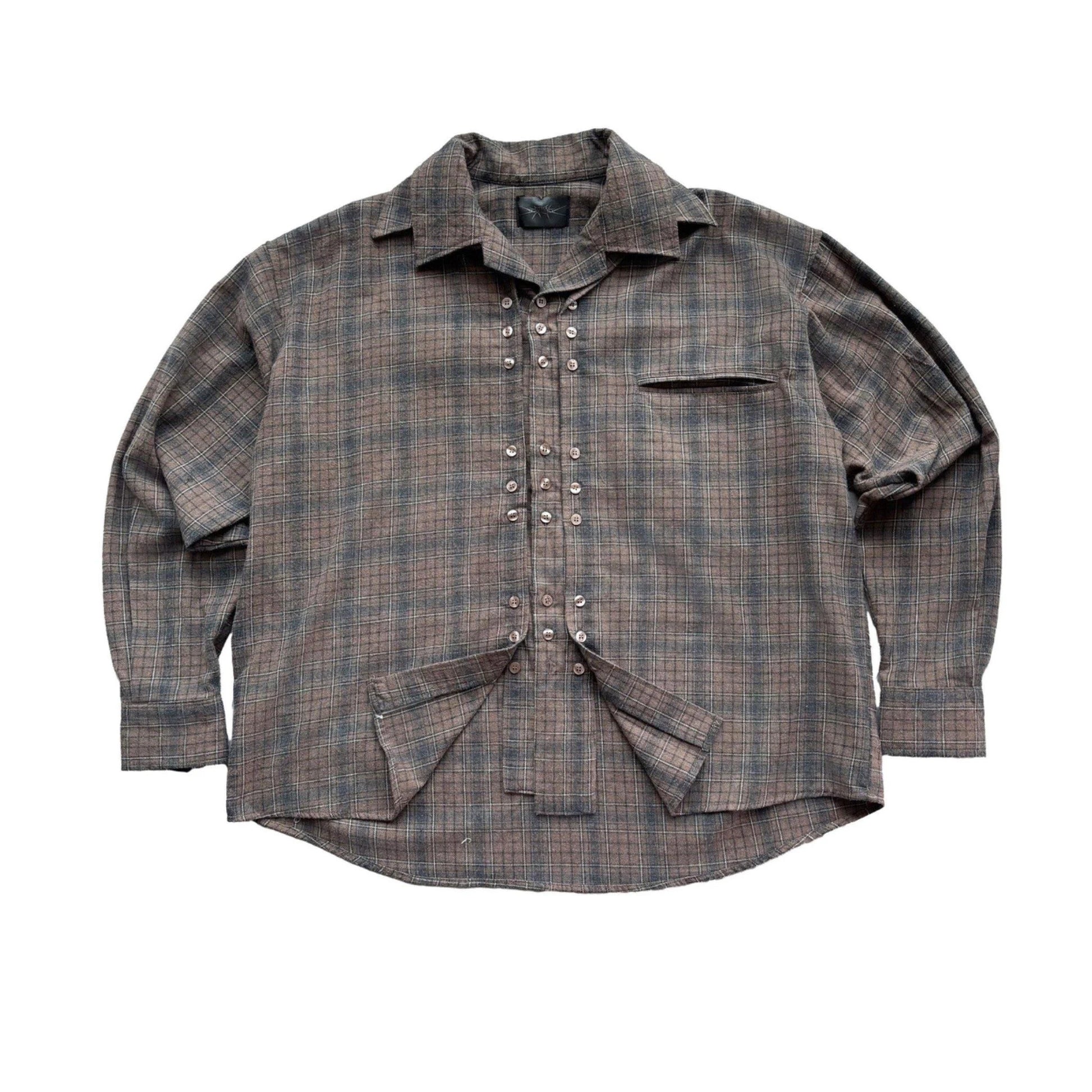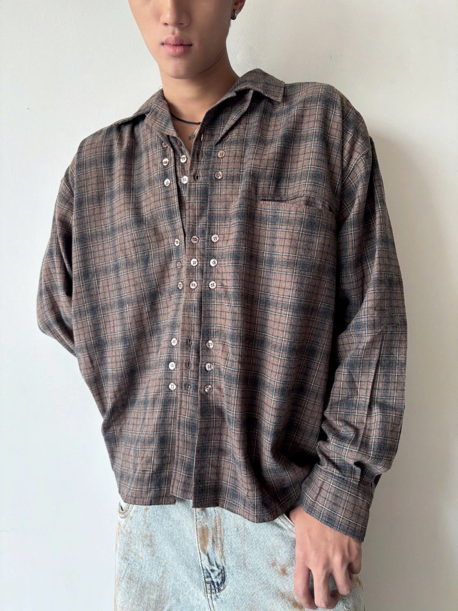 Design: The shirt is designed with an oversized fit. The front features three rows of buttons, with the middle row being detachable.